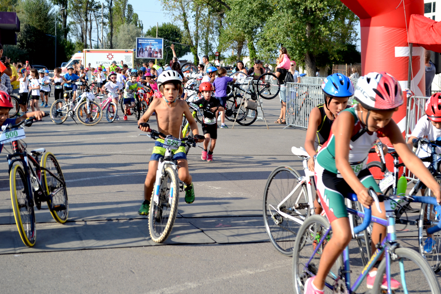 Ca și la alergare, n-am putut s-o văd cum începe proba de ciclism. Era prea multă lume acolo, iar în zona de tranziție, de unde trebuia să-și preia bicicleta au intrat deodată zeci de copii. Voluntarii și organizatorii de acolo au fost depășiți de situație, nu mai știau cui să dea mai întâi bicicleta. Și e destul de important să nu pierzi prea mult timp acolo, în această zonă. Bicicletele erau cocoțate pe niște rasteluri foarte înalte, iar Natalia și-a dat jos singurică bicicleta grea de 12 kg, apucând-o de undeva de deasupra capului. Adrenalina concursului a ajutat-o să se descurce și s-a avântat în cursa de ciclism fără să știe că eu, un tată iresponsabil și uituc, am uitat să-i reglez înălțimea șeii, care era ridicată la nivelul picioarelor lui Vlăduț. I-a fost greuț, după cum mi-a mărturisit, a pedalat mai mult din picioare, dar trei kilometri au trecut imediat. Avea de făcut șase întoarceri în ac de păr, adică la 180 de grade, dar n-a întâmpinat probleme, a ținut minte cum am exersat împreună întoarcerile, și le-a executat întocmai. A ridicat de fiecare dată pedala pe interiorul curbei, a coborât vitezele înainte de curbă, ca să poată ulterior să accelereze rapid în linie dreaptă, a făcut totul ca la carte, n-a căzut. Mulți copii s-au accidentat, însă, mai ales la întoarceri. Fie intrau în curbă cu viteză prea mare, fie nu reușeau să-și mențină echilibrul.
